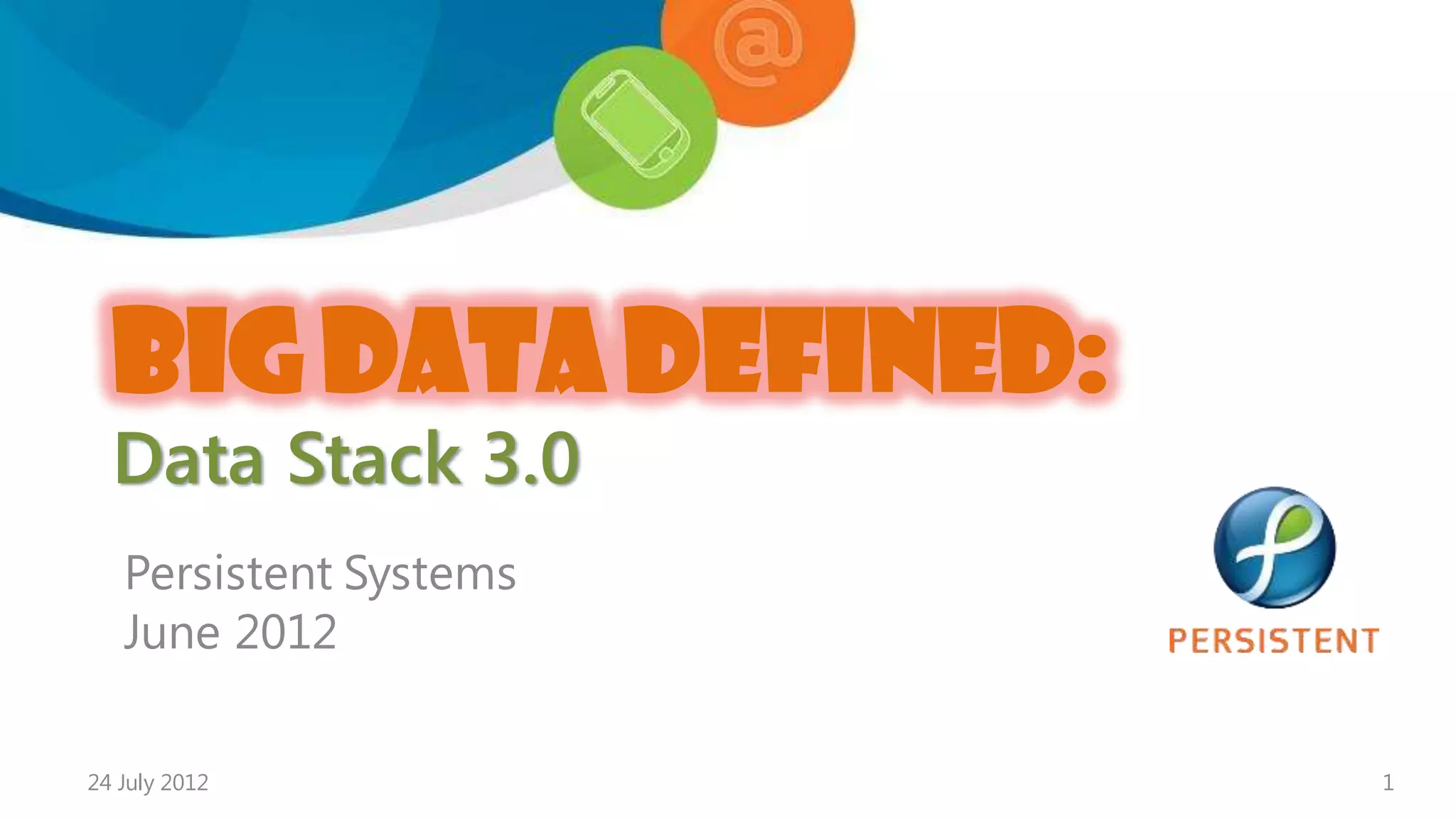 The document discusses big data and the need for a new data stack, Data Stack 3.0, to handle the variety, volume, and velocity of data. It notes that internet companies have already built their own data platforms to address similar problems at massive scale using open source software like Hadoop. Persistent Systems is presented as having expertise in big data through contributions to open source projects, pre-built solutions, and professional services to help enterprises implement big data solutions.