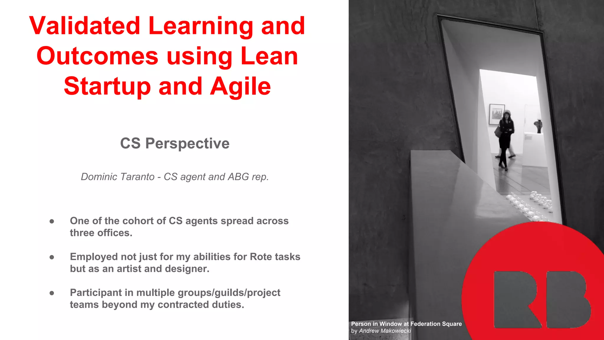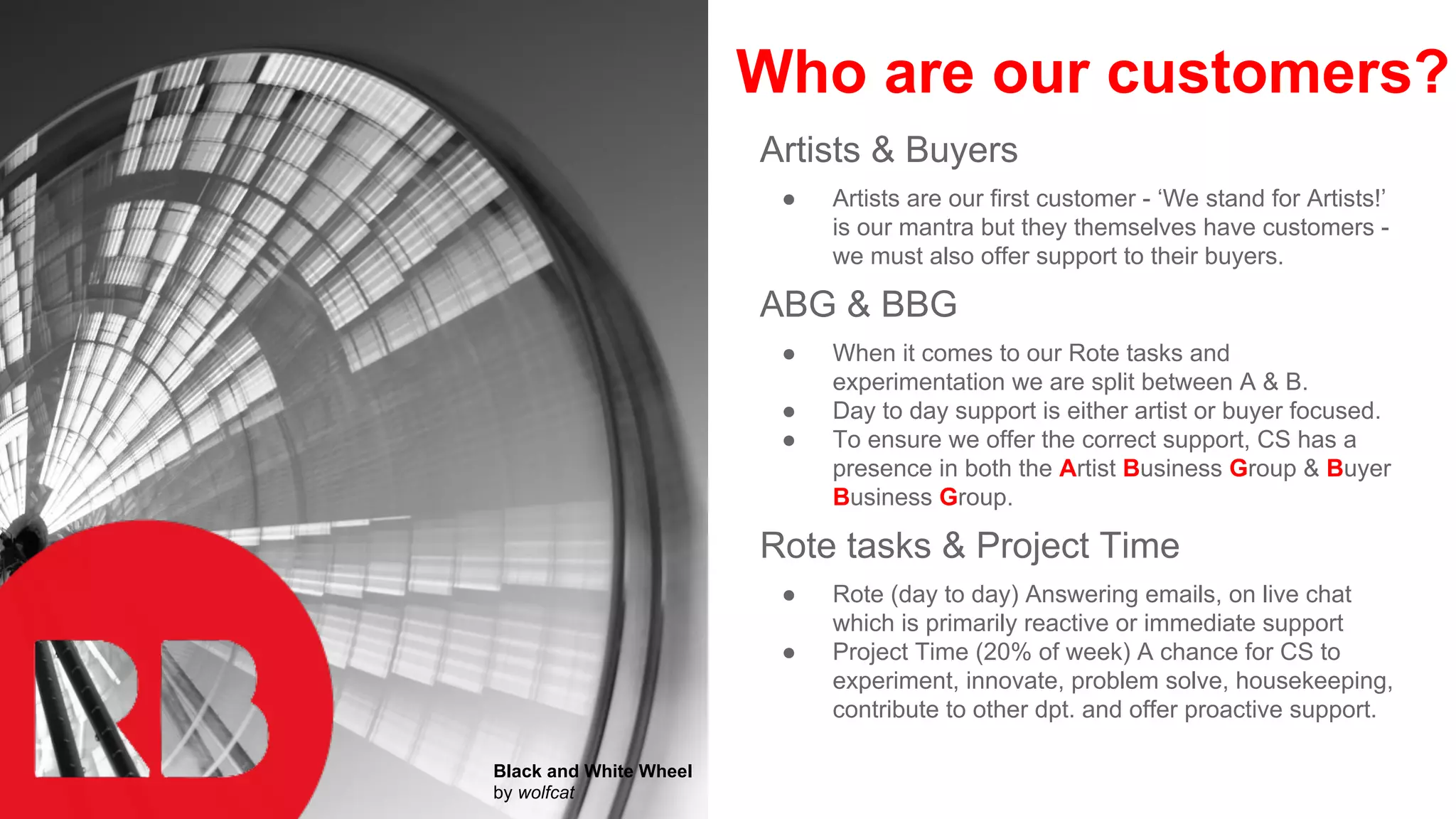 The document discusses the role of customer service (CS) agents at Redbubble, emphasizing support for both artists and buyers. It outlines their day-to-day tasks, project time for innovation, collaboration across teams, and strategies to enhance customer experience and artist loyalty. Tools like Trello, Logiforms, and Confluence are utilized for project management, data collection, and communication.