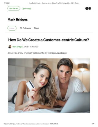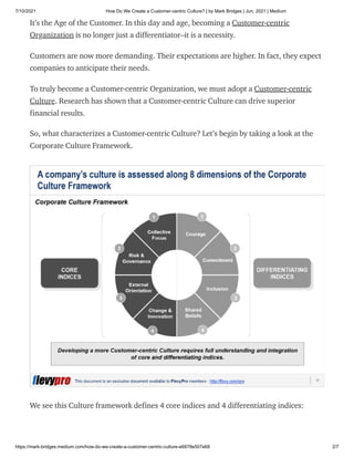 The article emphasizes the importance of establishing a customer-centric culture in organizations as a necessity for meeting the growing demands and expectations of customers. It outlines four core dimensions—collective focus, external orientation, change & innovation, and shared beliefs—that are crucial for creating this culture, advocating for employee training and feedback as essential practices. The document stresses that a deep understanding of customer needs and behaviors is vital for driving profitable growth and successful customer-centric design.