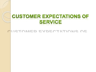 This document discusses customer service expectations. It begins by defining customer expectations and the different types or levels of expectations customers can have, including desired, adequate, and minimum tolerable expectations. It then examines factors that influence both desired expectations and adequate expectations, such as personal needs, perceived alternatives, and company communications. Finally, it discusses some current issues related to customer expectations, such as how to address unrealistic expectations, whether companies should try to exceed expectations, and if expectations continually escalate over time. The key is for companies to meet and ideally exceed customer expectations better than the competition to stay ahead.