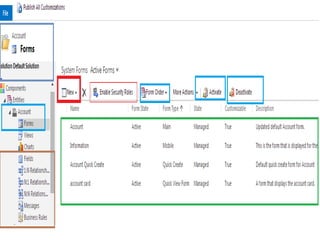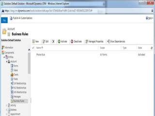 This document discusses customization and entity relationships in Microsoft Dynamics CRM. It describes how customizations are packaged in solutions and how entity definitions, properties, and relationships are configured. Relationship behaviors like restricting deletes, cascading actions, and automating processes when records are shared, deleted, or reassigned are also covered. The document provides examples of how these relationship options should be set based on the specific business needs.