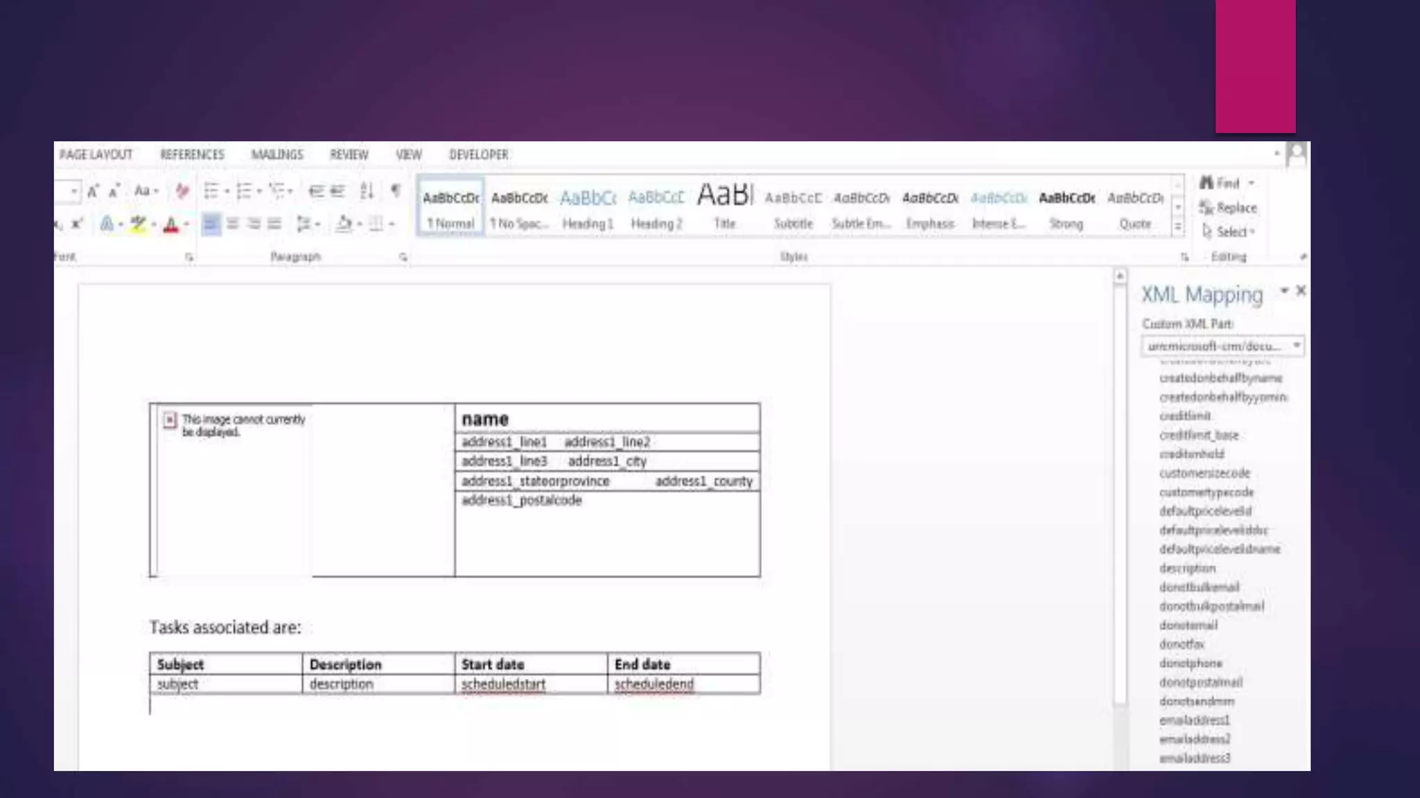 The document provides a step-by-step guide on customizing document templates in Microsoft Dynamics CRM 2016, specifically for creating a Word template associated with an account entity. It outlines the processes for selecting the account and task entities, using the XML mapping pane for designing the document, and uploading the customized template back into CRM. The final output allows users to generate documents that include account details and associated tasks.