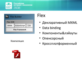 Документ представляет собой руководство по кастомизации пользовательских интерфейсов в flex-приложениях, охватывая темы, такие как декларативный MXML, компоненты и использование CSS. В нем объясняется, как применять стили и скины к элементам интерфейса, а также описываются принципы работы с Flex Builder и SDK. Также затрагиваются темы рабочего процесса между дизайнерами и разработчиками, а также предоставляются ссылки для дальнейшего изучения.