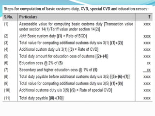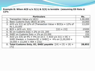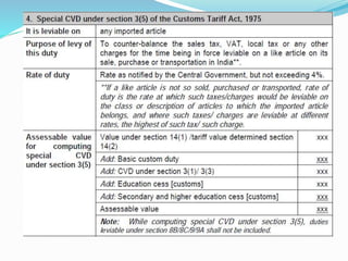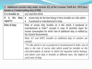There are several types of customs duties that can be levied on imported goods into India. Additional customs duty as per Section 3 of the Customs Tariff Act includes: 1) duty equivalent to excise duty under Section 3(1), also known as countervailing duty; 2) duty to counterbalance excise duties on raw materials under Section 3(3); and 3) duty to counterbalance state taxes like VAT under Section 3(5). Other duties include protective duties under Section 6, safeguard duties under Section 8B, countervailing duties on subsidized articles under Section 9, and anti-dumping duties under Section 9A.