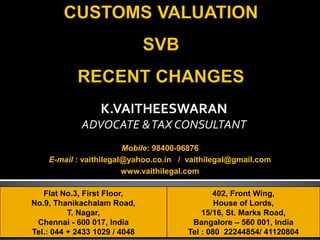 This document outlines new procedures for Special Valuation Branch (SVB) investigations of related party transactions under Indian customs valuation rules. Key points include: SVB investigations will now be based on questionnaires submitted with bills of entry rather than automatic for related parties; no extra duty deposits will be required upfront but can be imposed if information is not provided; SVB has strict timelines to issue investigation reports to streamline assessments; renewals of SVB orders are discontinued; importers can make one-time declarations to close existing renewal cases. The changes aim to reduce transaction costs and delays associated with SVB investigations.