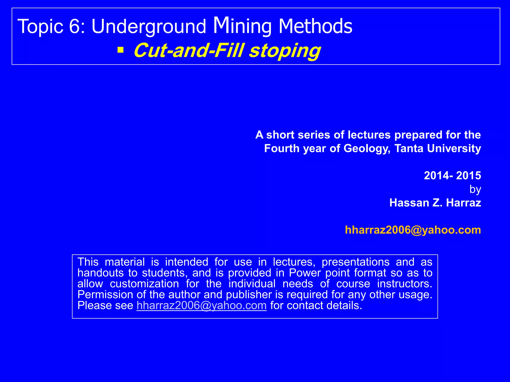 The document serves as educational material on the cut-and-fill (C&F) mining method, detailing its processes, applications, advantages, and disadvantages. It explains that C&F is a selective mining technique ideal for high-grade ore deposits, involving the extraction of ore in horizontal slices that are backfilled to support stope walls. Additionally, the method is versatile, applicable to various geometrical shapes of ore bodies, but also labor-intensive and expensive.