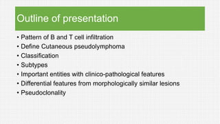 The document discusses cutaneous pseudolymphoma, defining it as a group of skin lesions with lymphocyte-rich infiltrates that mimic cutaneous lymphoma. It provides detailed classifications, clinical presentations, and histopathological features associated with various subtypes, including both T-cell and B-cell pseudolymphomas, their differential diagnoses, and important immunohistochemical markers. Highlights include clinical correlations, important causes, and specific diagnostic considerations for differentiating pseudolymphomas from true lymphomas.