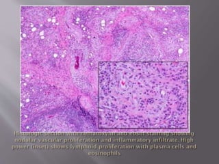 This document discusses cutaneous pseudolymphoma (CPL). It was first described in 1891 and has been called by various names over time. Pseudolymphoma clinically and sometimes histologically mimics lymphoma, but has benign behavior and does not meet criteria for malignant lymphoma. It is characterized by lymphocytic infiltration in the skin in response to stimuli. CPL is classified into types depending on the predominant cell type (B cell vs T cell) and location of infiltration (nodular vs stripe-like). While CPL has no associated mortality, localized variants can cause minor symptoms. Treatment involves excision, corticosteroids, radiation therapy, and immunosuppressants depending on the subtype.