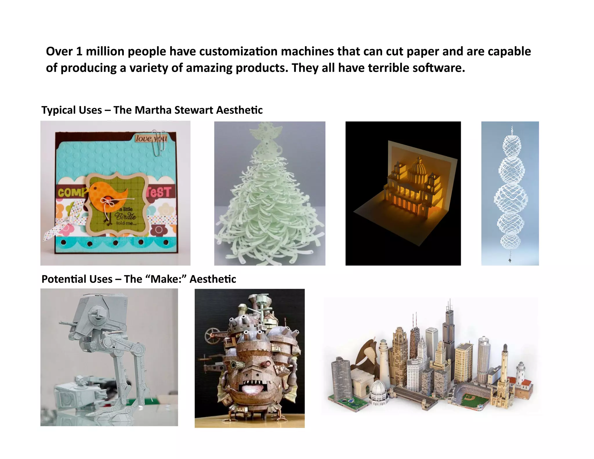 The document is a proposal for a startup idea involving a new software and hardware solution for paper cutting machines that circumvents expensive cartridge costs through an iTunes-style subscription model. It identifies a significant market opportunity in the hobbyist sector and discusses potential revenue streams while addressing challenges such as customer convenience and competition. The author is seeking a co-founder with relevant experience to help develop and market the product.