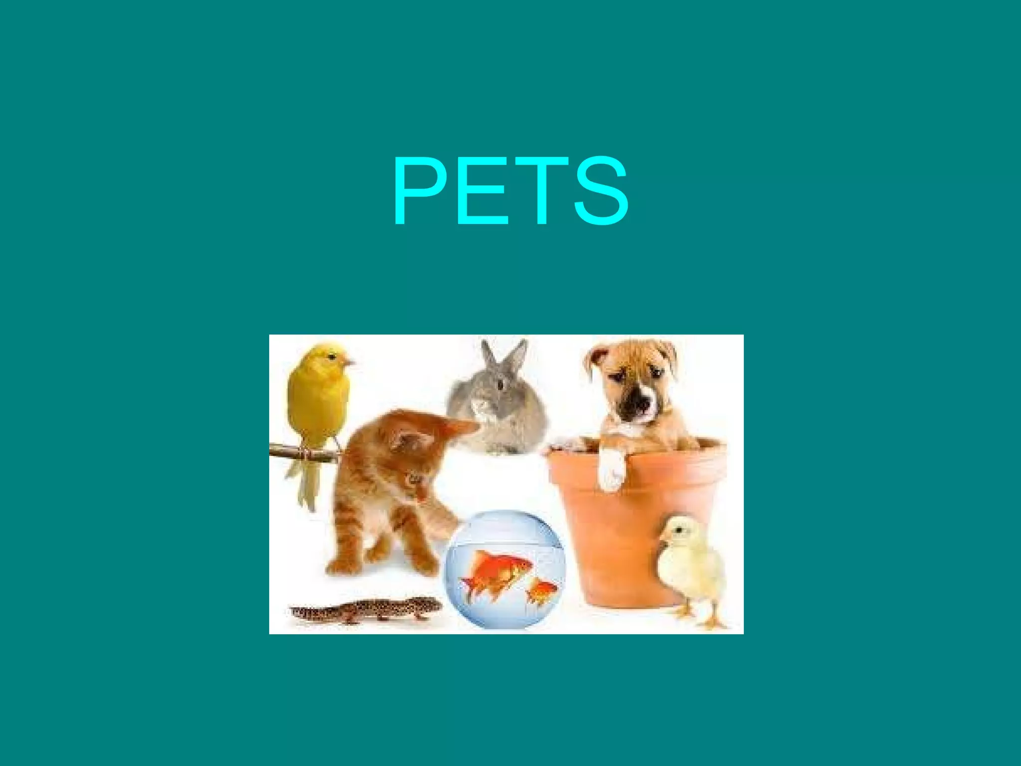 This document describes different types of pets, including a dog, cat, bird, chick, hamster, duck, fish, tortoise, and rabbit. Each line introduces a different common household pet or animal.