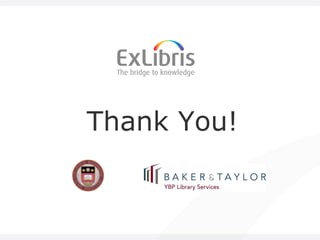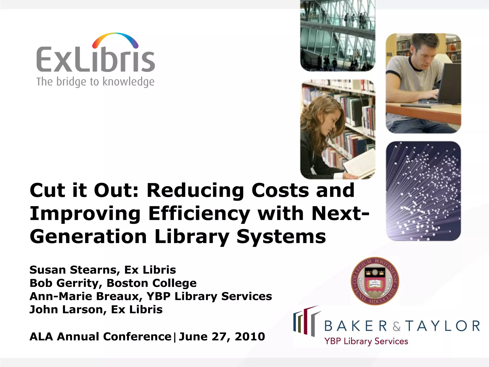 The document summarizes a presentation about reducing costs and improving efficiency in libraries through next-generation library systems. It discusses challenges faced by libraries in difficult economic times and the need to streamline workflows and reduce total cost of ownership. Presenters provided perspectives from different library roles and discussed how automation, integration between systems, and a unified resource management approach can help lower costs while improving services.