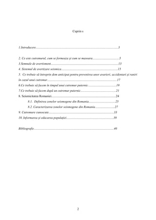 Documentul analizează cutremurele de pământ, explicând cauzele și modul în care acestea se formează, precum și impactul lor distrugător asupra construcțiilor și populației. Se discută despre natura seismologică, semnalele de avertizare și importanța proiectării de construcții rezistente în zonele seismogene. De asemenea, textul evidențiază progresele în studierea cutremurelor și dificultățile în prezicerea acestora.