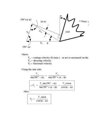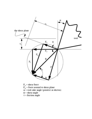 The document discusses orthogonal cutting and how to calculate cutting forces. It describes orthogonal cutting as assuming the cutting edge is perpendicular to the direction of tool motion, allowing analysis in one plane. It can be achieved by turning a thin-walled tube with the cutting edge perpendicular to the tube axis. The document then discusses measuring cutting and tangential forces using a dynamometer and calculating velocities and forces using vector diagrams, including Merchant's force circle method.