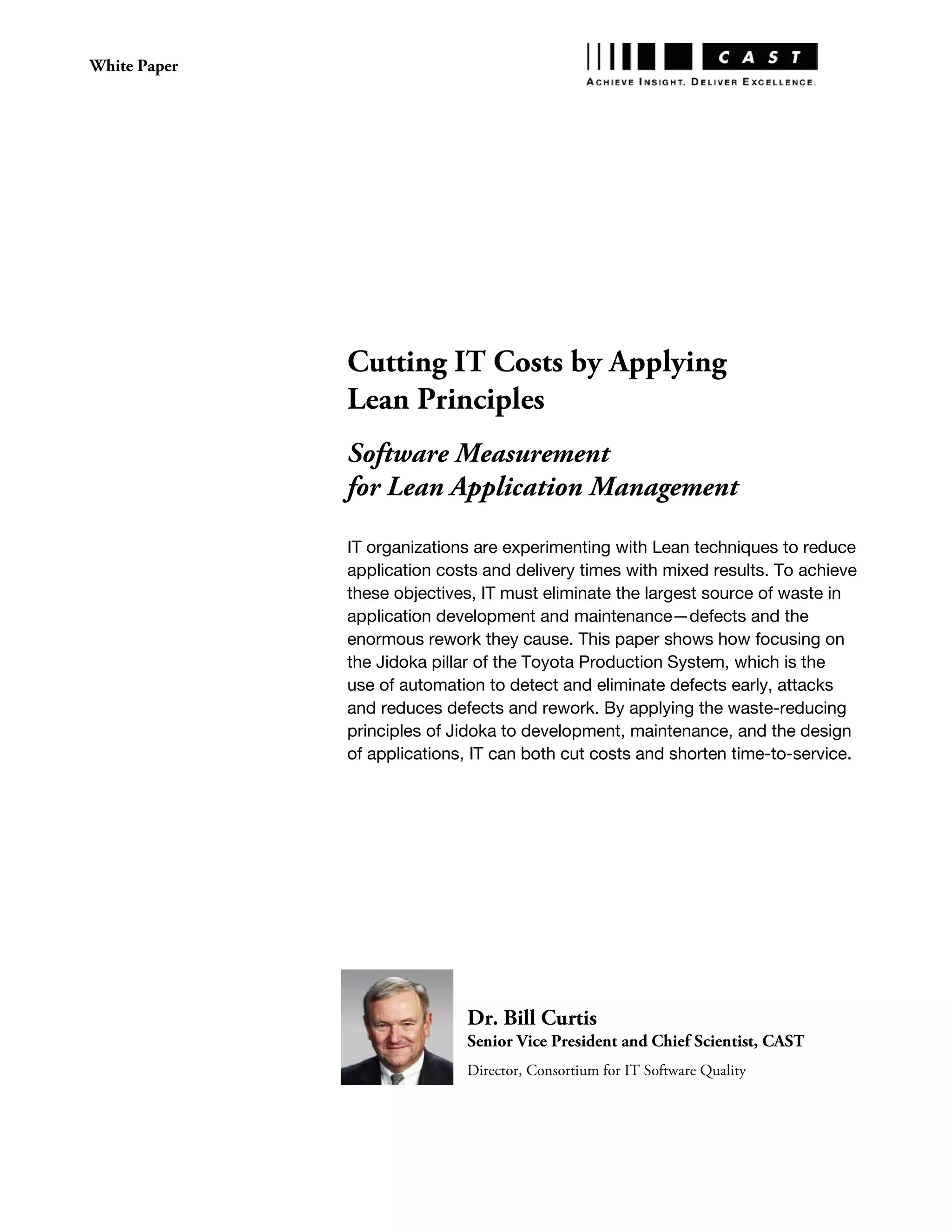 This document discusses applying lean principles, specifically the jidoka pillar from the Toyota Production System, to reduce costs and improve efficiency in IT application management. It emphasizes that by focusing on the early detection and elimination of defects, IT organizations can dramatically minimize waste associated with rework and enhance overall productivity. Key strategies include automated software measurement, maintaining application quality throughout its lifecycle, and continually training developers to produce defect-free work.