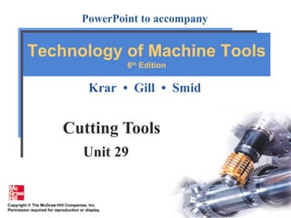 This document provides an overview of cutting tools and cutting fluids. It begins by defining the objectives of understanding cutting tool nomenclature, materials, and applications. It then describes different types of cutting tools, such as high-speed steel, cemented carbides, ceramics, and diamond toolbits. It also discusses cutting fluid types like oils, emulsifiable oils, and chemical fluids, and their functions in cooling, lubricating, and prolonging tool life during machining operations.