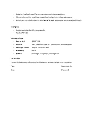 This resume is for Shabnam.S, who graduated in 2014 with a degree in Computer Science and Engineering. She lists her email, phone number, education history which includes graduating with over 65% from college and over 70% from intermediate school. Her skills include programming languages like C and Java, Microsoft Office, SQL, and operating systems. She completed a 3 month project on privacy-preserving delegated access control in public clouds. She has received prizes for her school and painting achievements. Her strengths are problem solving and a positive attitude.