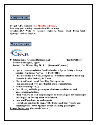 This document provides a summary of Mohamed Maher Mahmoud Kamel Wally's personal and professional background. It includes his contact information, education history, computer skills, and work experience in aviation, customer service, and tourism roles. His objective is seeking a challenging opportunity to advance his qualifications, education, and skills in his industry. He has a bachelor's degree in accounting and is fluent in Arabic and English.