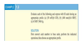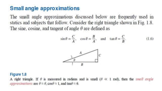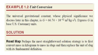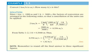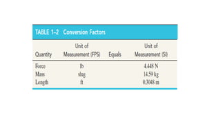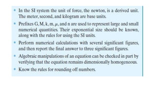 This document outlines the principles of engineering mechanics, focusing on the study of rigid-body mechanics, including statics and dynamics. It explains fundamental concepts such as mass, force, and weight, along with Newton's three laws of motion, and emphasizes the importance of dimensional homogeneity in calculations. The text provides a structured approach to problem-solving within this field, encouraging logical analysis and significant figure accuracy.