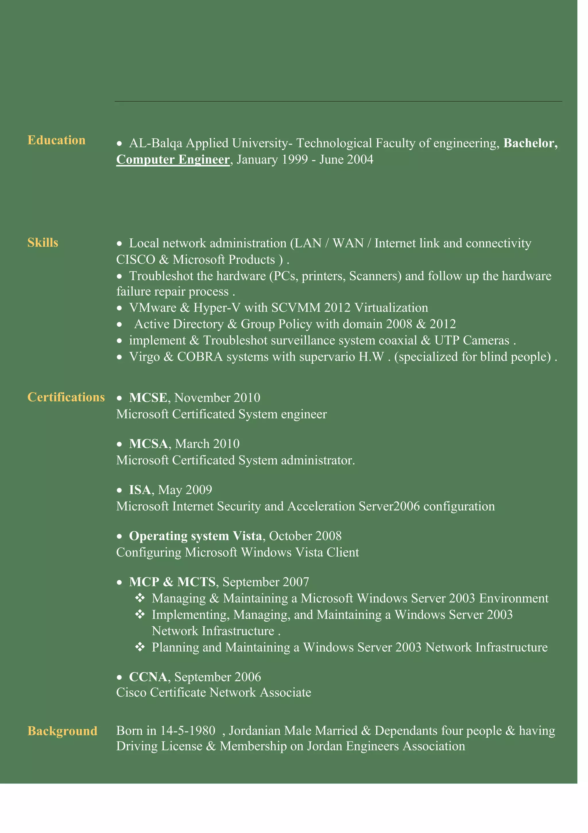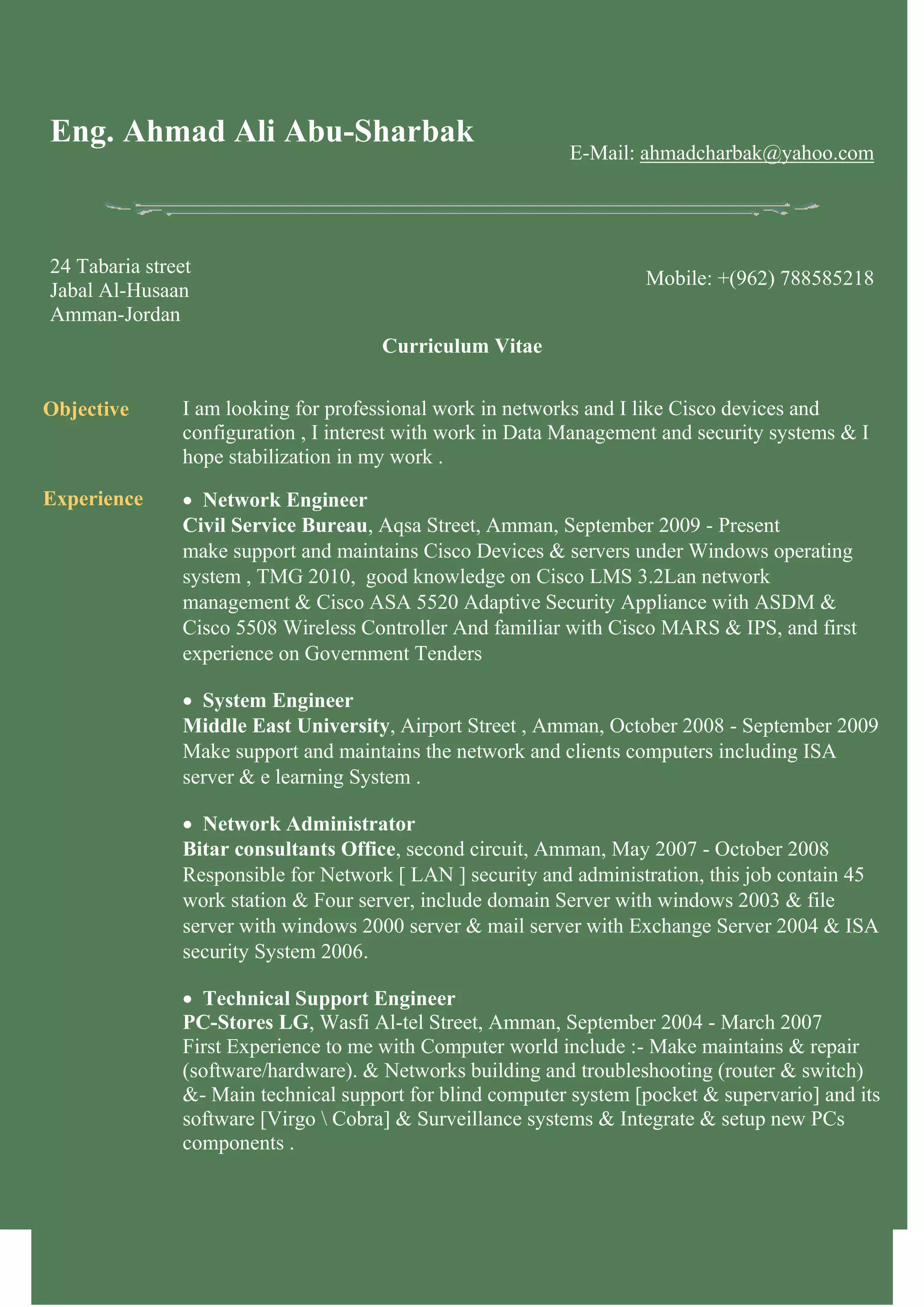Eng. Ahmad Ali Abu-Sharbak is seeking a position involving networks, with a focus on Cisco devices and configuration. He has over 10 years of experience in network engineering, system engineering, and network administration. His experience includes supporting Cisco devices, servers, and networks for government agencies and universities in Jordan.