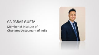 This document provides information about Paras Gupta, including his education, experience, skills, and objectives. It details his qualifications as a Chartered Accountant in India and experience in auditing, taxation, pricing, and finance roles over 3 years. His most recent role was as a Factory Finance Controller for a leading FMCG company in Nigeria, where he was responsible for the overall financial management and operations of a factory. The document emphasizes his commitment to meeting deadlines and developing a wide business perspective.