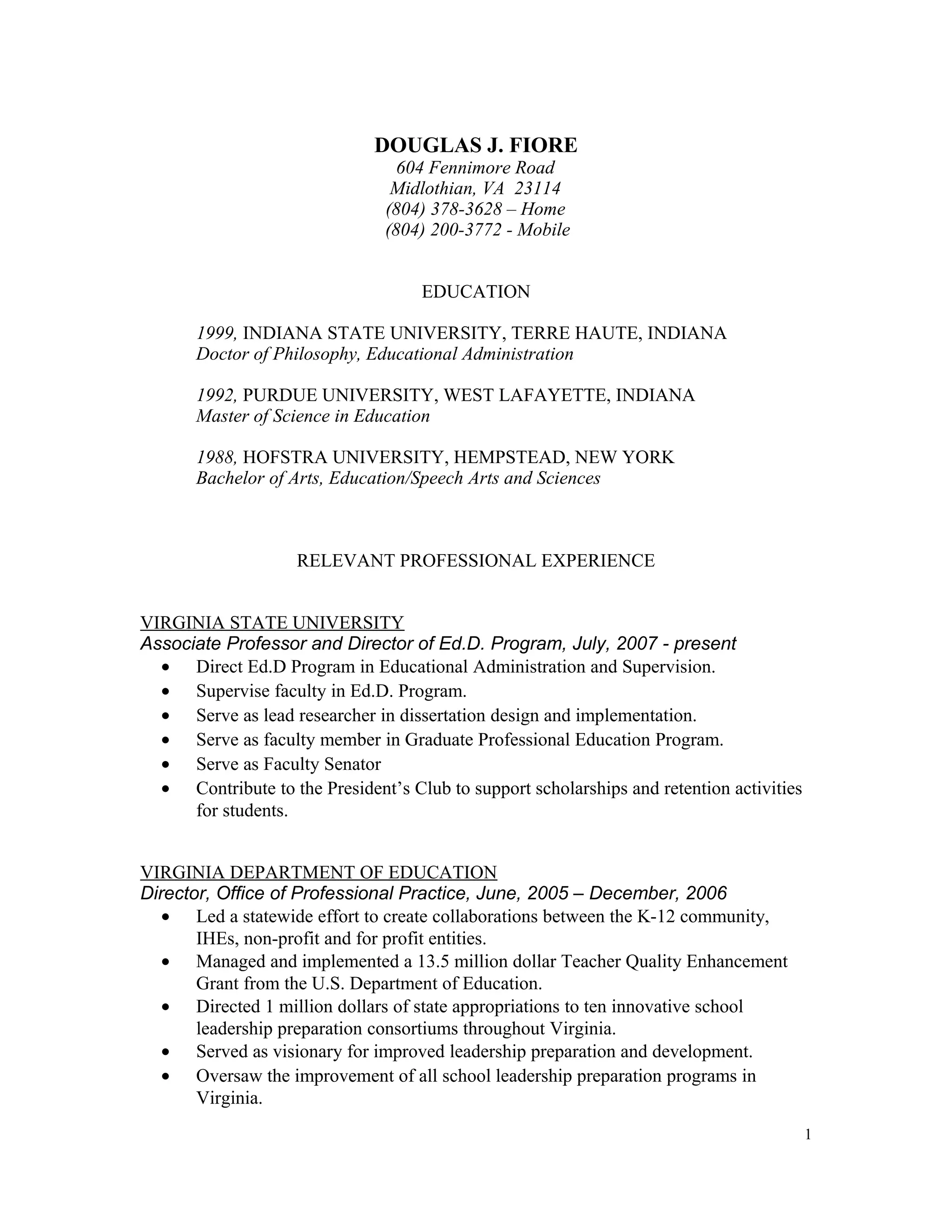 The document provides a resume for Douglas J. Fiore, including his contact information, education history, relevant professional experience, specialized credentials, publications, and presentations. Some key details: