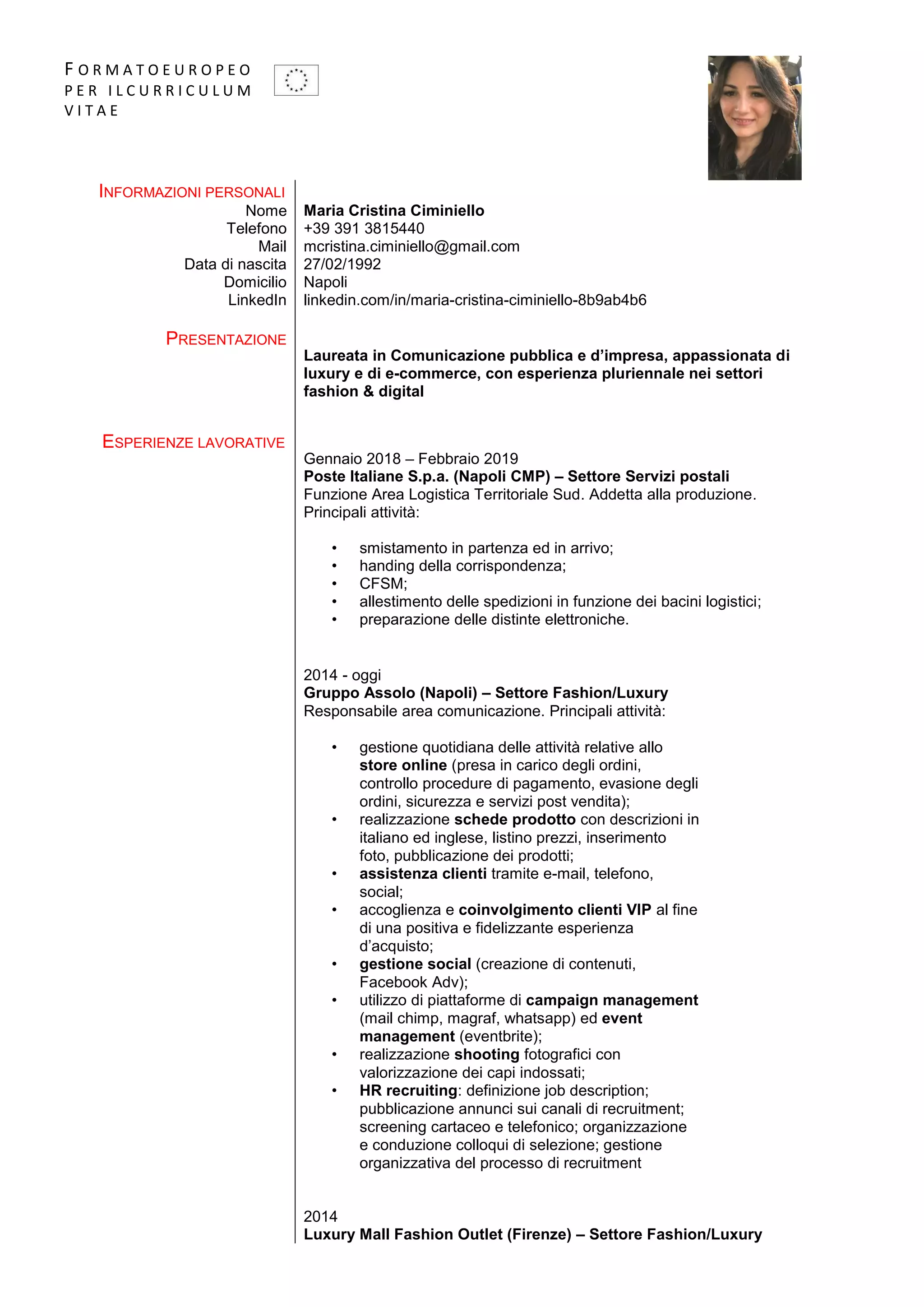 Maria Cristina Ciminiello è una laureata in comunicazione pubblica con esperienza nel settore fashion e luxury, attualmente responsabile della comunicazione per un'azienda di moda. Ha lavorato in Poste Italiane e ha acquisito competenze in gestione e vendite online, assistenza clienti e social media. Possiede diverse certificazioni e competenze tecniche, ed è disponibile a trasferte in Italia e all'estero.
