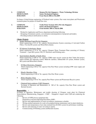 This curriculum vitae outlines the educational and professional experience of R. Rajaraman. It includes his personal details, education qualifications including a diploma in mechanical engineering and bachelor's degree in business administration. It then details his 11 previous roles in water treatment engineering and consulting spanning from 1987 to present, including responsibilities and achievements. The roles show progression from design engineer and sales engineer to current role as an independent consultant, primarily focusing on water treatment systems.