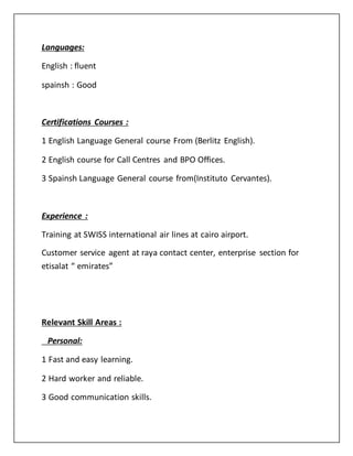 Olivia Nagy Gattas Ibrahuim is seeking a challenging training position in a stable company offering career growth. She graduated from Ain Shams University's Spanish Department with a good grade. She is fluent in English and good in Spanish. Her experience includes training at Swiss International Airlines and working as a customer service agent at Raya Contact Center. She has strong personal skills like fast learning, reliability, communication, and teamwork. She is proficient in computer skills like internet research and Microsoft Office.