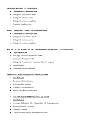 Marie Nugent has over 15 years of experience in customer service and sales roles. She has worked for several telecommunications companies in customer service and sales roles, dealing with large call volumes, queries, complaints, and installations. She also has experience in childcare, organizing social events, and volunteering with an animal sanctuary. Her skills include Microsoft Office, communications, and she is looking to complete an Access certification.