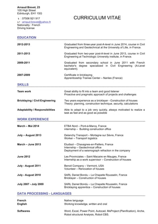 Arnaud Brevet is a 23-year-old civil engineer from France with experience in bricklaying and construction. He has graduated from post-A-level courses in civil engineering and geotechnical engineering. He also has a certificate in bricklaying and several internships and jobs related to construction. He has strong teamwork skills and is highly motivated and adaptable.