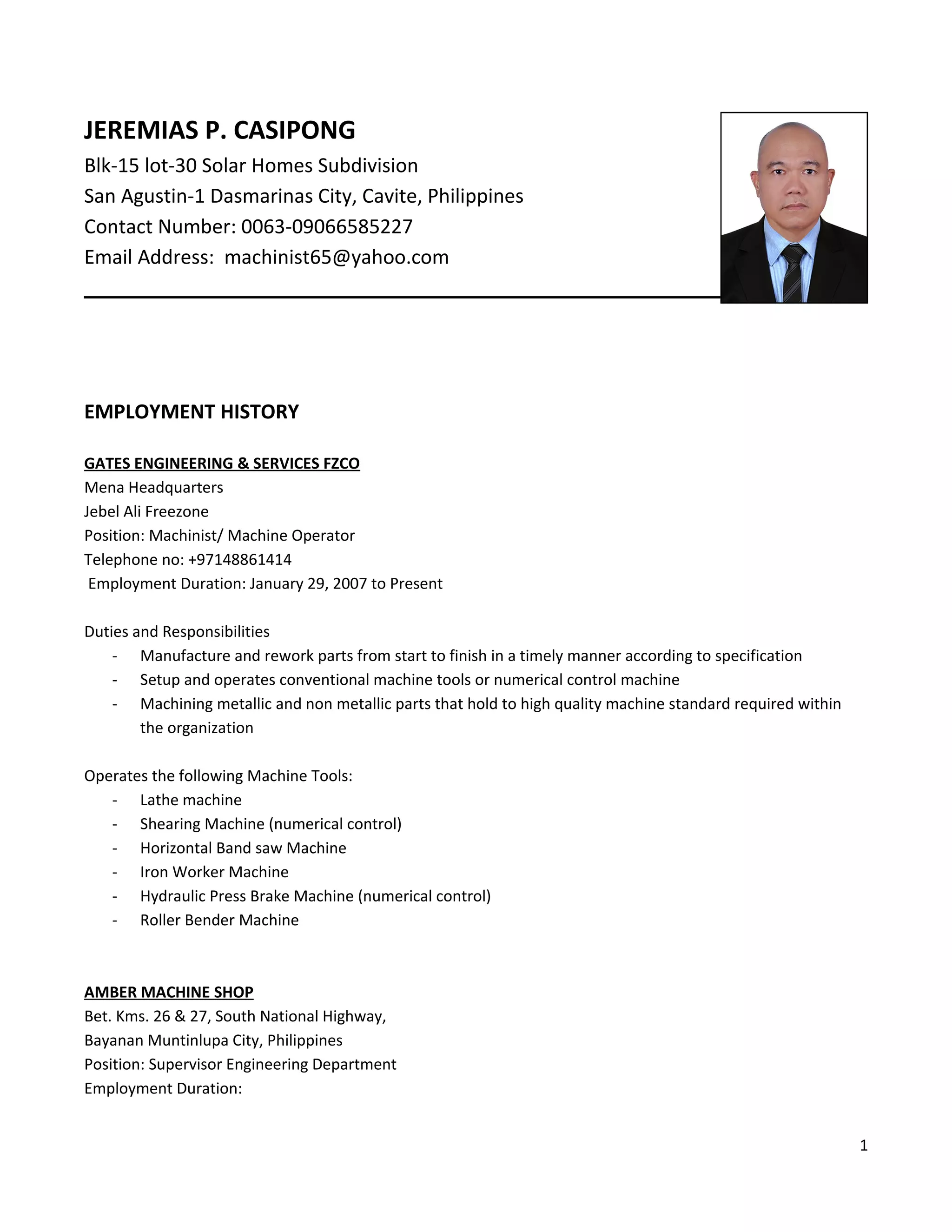 The document details the employment history and qualifications of Jeremias P. Casipong, a machinist with extensive experience in various machine operations, supervision, and maintenance across multiple organizations, including military and engineering sectors. It includes positions held, duration of employment, key responsibilities, and notable achievements. Additionally, personal data such as educational background and training completed are summarized.