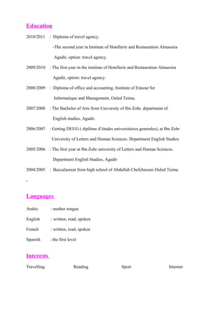 Mohamed Atnane is a 34-year-old single Moroccan man currently living in Al Ain, UAE. He has over 10 years of experience in hospitality industries including roles as a front desk supervisor and receptionist. He is reliable, well-organized and comfortable working independently or as part of a team. Atnane is proficient in Microsoft Office, English, French, and Spanish. His education includes a diploma in travel agency and a Bachelor's degree in English studies.