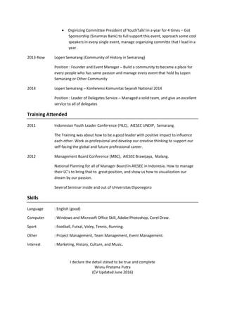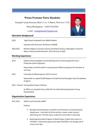 This document is a curriculum vitae for Wisnu Pratama Putra Handoko that summarizes his education and work experience. It includes details about his high school and university education in Indonesia as well as internship and work experience in banking and event organizing. It also lists involvement in student organizations and leadership roles held, training attended, skills, languages, interests and a declaration of truth.
