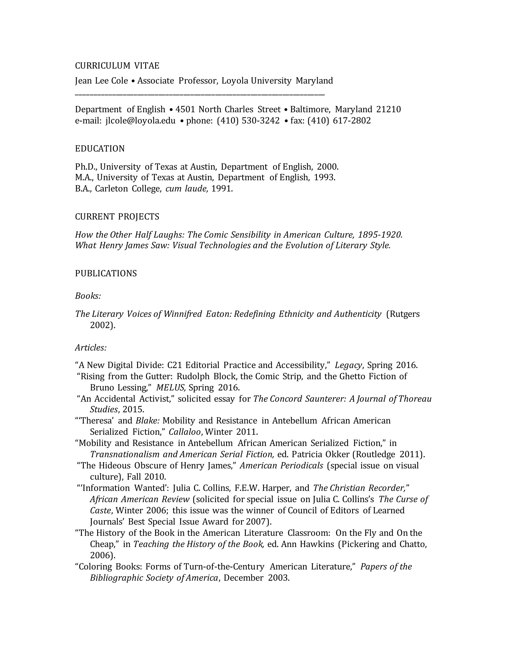Jean Lee Cole is an Associate Professor at Loyola University Maryland who specializes in 19th and early 20th century American literature. Her research focuses on the comic sensibility in American culture between 1895-1920 and how visual technologies evolved literary style. She has published several books and articles on these topics. Her CV provides details of her education, current projects, publications, teaching experience, presentations, and awards.