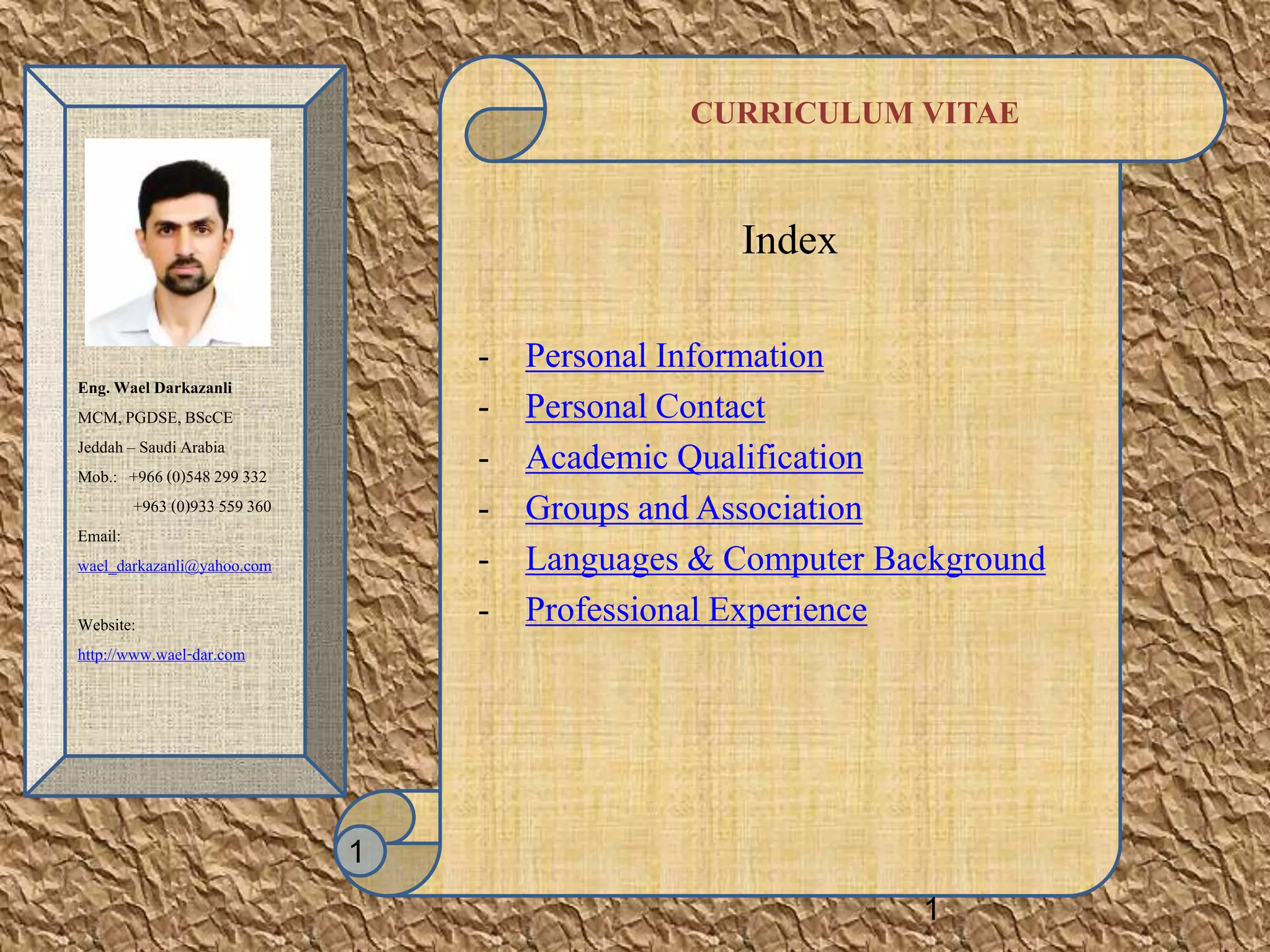 This curriculum vitae outlines the professional experience and qualifications of Eng. Wael Darkazanli. It provides personal details such as contact information, education history including a Master's in Construction Management and Bachelor's in Civil/Structural Engineering. It also lists work experience with companies such as FADEN Trading and Contracting in Saudi Arabia and Redco International in Qatar, describing roles and responsibilities as well as notable projects.