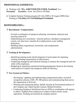 This curriculum vitae is for Kamal Kishore, who has an MBA in human resources and finance/international business. He has over 10 years of experience in personnel and human resources. Currently he works as a Personnel Executive at M/s. ASHUTOSH POLYMER in Faridabad, where his responsibilities include recruitment, compensation, training, performance management, and developing HR policies. He is married and fluent in English and Hindi.
