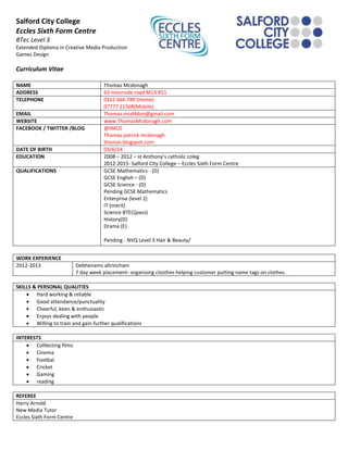 This curriculum vitae provides details about Thomas McDonagh, including his contact information, education history, qualifications, work experience at Debenhams, skills, interests, and referee of Harry Arnold, his new media tutor at Eccles Sixth Form Centre. Thomas is currently studying for a BTEC Level 3 Extended Diploma in Creative Media Production in Games Design at Salford City College and Eccles Sixth Form Centre.