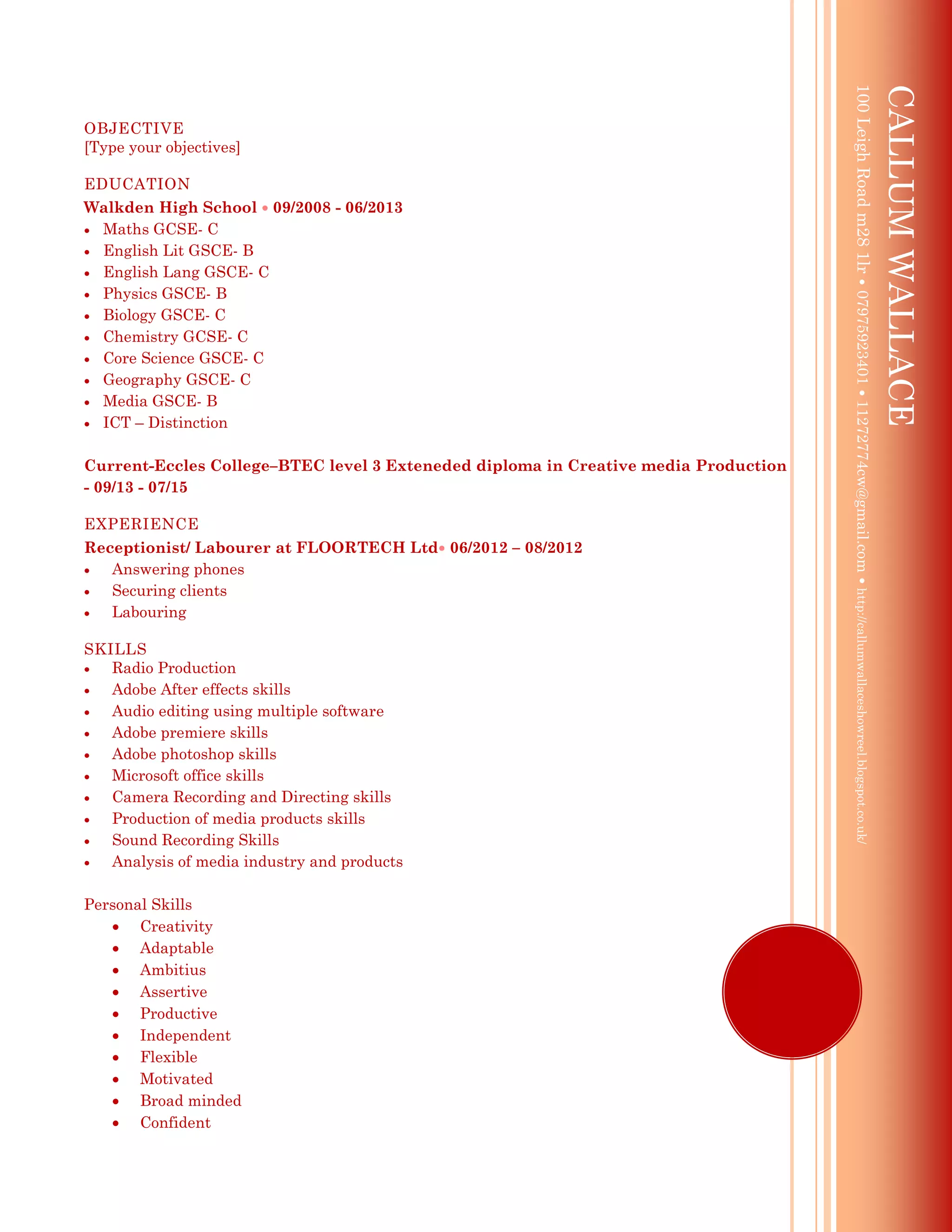 This document is a resume for Callum Wallace providing education and experience information. It details his education at Walkden High School from 2008-2013 where he earned various GCSEs, and his current study for a BTEC level 3 Extended Diploma in Creative Media Production at Eccles College from 2013-2015. It also lists previous work experience as a receptionist and laborer at FLOORTECH Ltd from 2012. Technical skills in areas such as radio production, video editing, audio editing, and photography are outlined along with personal skills of creativity, adaptability, and motivation. References and contact information are provided at the end.