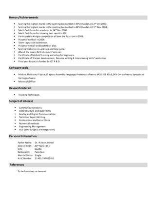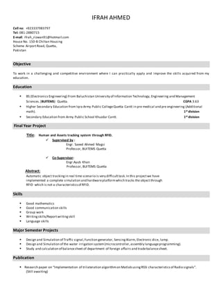 Ifrah Ahmed is seeking a challenging position where she can apply her skills in electronics engineering. She has a B.S. in Electronics Engineering from BUITEMS with a 3.63 CGPA. Her final year project involved implementing RFID tracking and she has skills in mathematics, communication, programming and report writing. She held achievements in academic and sports competitions and has experience with simulation tools and programming languages.
