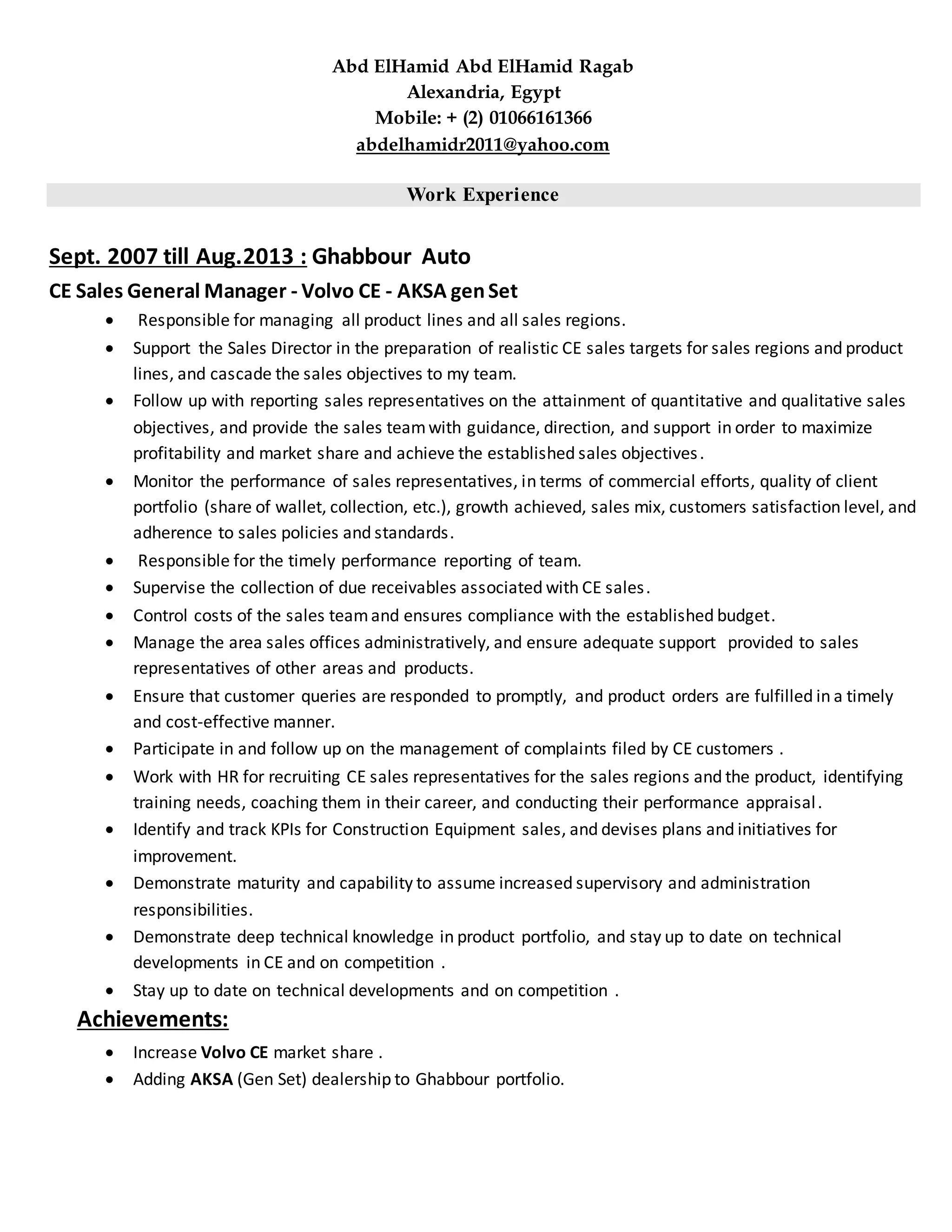 This document contains a summary of Abd ElHamid Abd ElHamid Ragab's work experience and qualifications. It details his experience managing sales of construction equipment and parts across several roles from 2007 to 1989 in Egypt and Saudi Arabia. It also lists his educational background of a Bachelor's degree in Agricultural Engineering from Alexandria University in 1980. Personal details of Egyptian nationality, marital status, and date of birth are provided at the end.