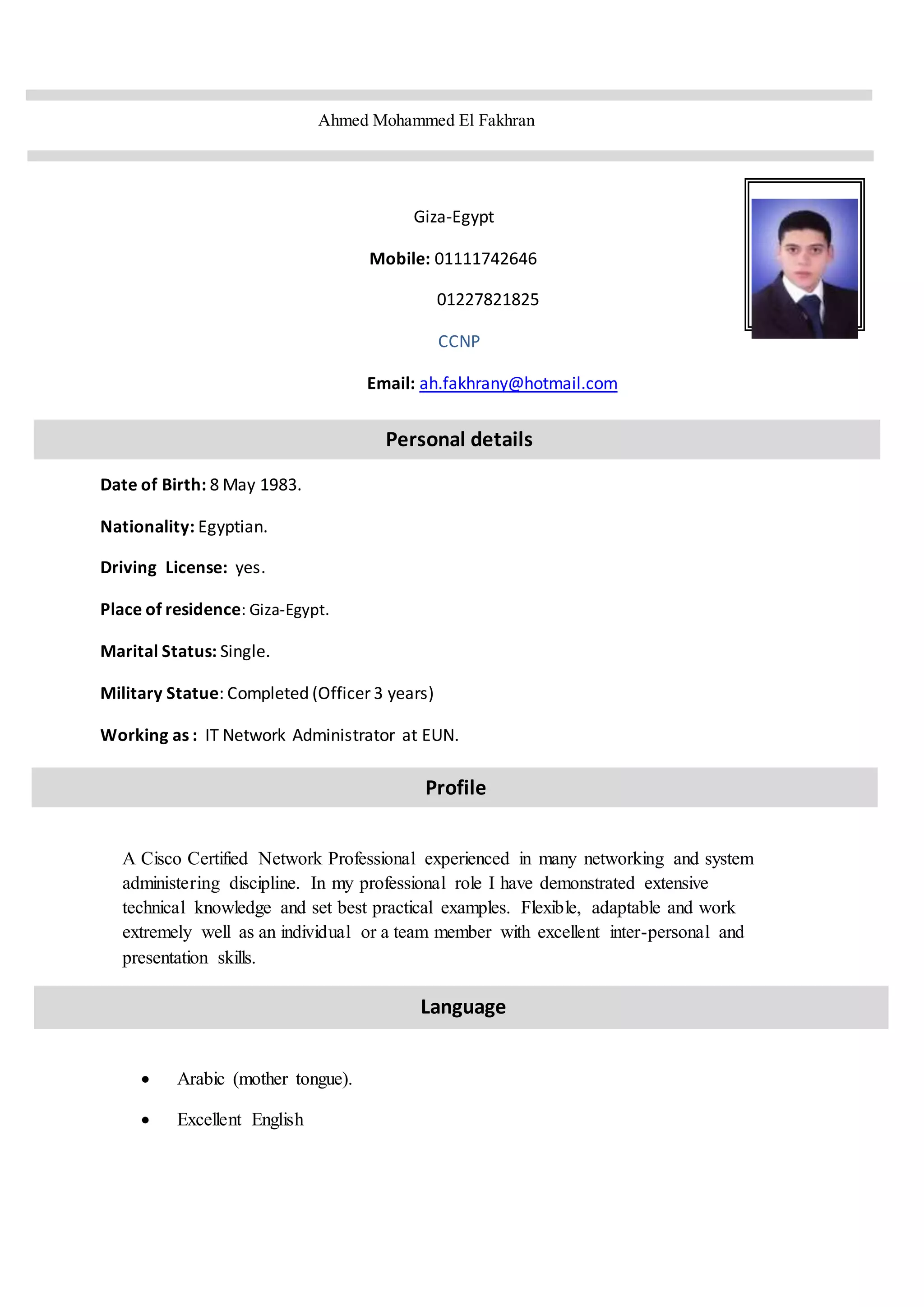 Ahmed Fakhrany is an Egyptian national who currently works as an IT Network Administrator at EUN. He has a BSC in Electronic Engineering and holds several Cisco certifications including CCNA, CCNP, and CCNA voice CME. He has over 8 years of experience installing, repairing, and managing networks for governmental Egyptian universities.