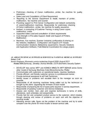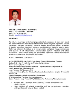 This document provides a summary of Christian Velasquez Tolentino's work experience and qualifications. It lists over 10 years of experience in technical support roles for electronic equipment like photocopiers and printers. Recent experience includes over 3 years as a Service Technician for Canon in Dubai, where responsibilities included installation, maintenance and customer support. Education includes a Bachelor's degree in Electronics Engineering Technology.