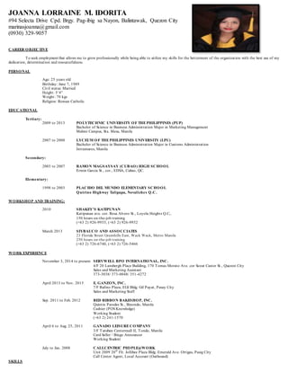 This document contains a resume for Joanna Lorraine D. Mariñas. It summarizes her personal details, education history, work experience, skills, seminars attended, seminars conducted, events organized, trade exhibits handled, and products handled. Her objective is to seek employment that allows professional growth while utilizing her skills to benefit the organization. She has a bachelor's degree in business administration and over 5 years of work experience in sales, marketing, and event planning roles.