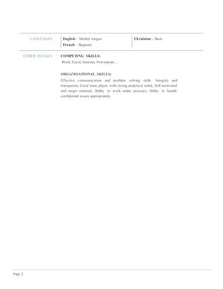 Oluwakemi Ope-Ifa is seeking an internship from April to September 2015. She has experience in office administration through an internship at a travel agency and has sales experience through positions at Avon and a supermarket. She holds a Master's degree in International Management from IAE University of Bordeaux and a Bachelor's degree in International Economics from Ternopil National Economic University. She also has diplomas in Desktop Publishing and High School. Oluwakemi has skills in communications, problem solving, teamwork and computing.