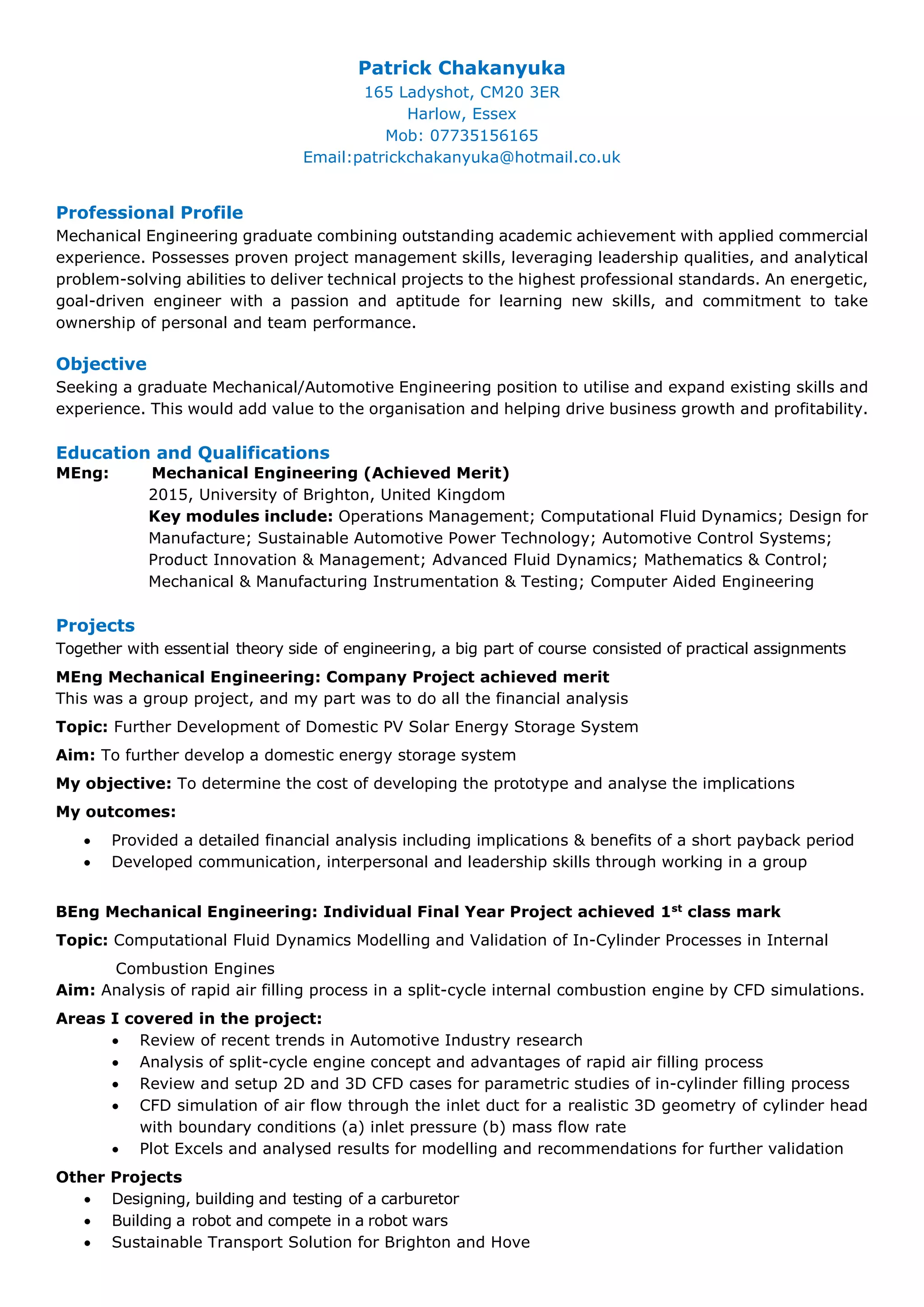 Patrick Chakanyuka is a mechanical engineering graduate seeking a graduate position. He has a MEng in Mechanical Engineering from the University of Brighton with a merit, as well as qualifications in automotive engineering and motor industry management from Zimbabwe. His project experience includes financial analysis of a domestic PV solar energy storage system and CFD modeling of in-cylinder processes in internal combustion engines. He has work experience in retail merchandising and as a warehouseman, and previously worked as an apprentice and qualified mechanic in Zimbabwe.