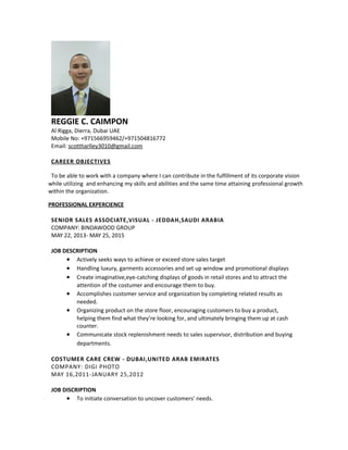 This document contains a resume for Reggie C. Caimpon. It summarizes his professional experience working in senior sales and customer care roles in Saudi Arabia and Dubai from 2011 to 2015. It also lists his skills, qualifications, and education including a college degree in electronics and high school education in the Philippines.