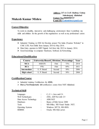 Mukesh Kumar Mishra is seeking a job in a challenging environment where he can contribute his skills and grow professionally. He has experience in software development through an internship creating a tourism website. He also has experience as a data entry operator. Mukesh has an MCA degree and certifications in J2EE and .NET frameworks. His technical skills include languages like Java and databases like SQL Server. He also has strong communication, analytical, and leadership abilities.