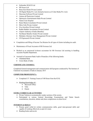 Farhana Sait is a female chartered accountant seeking a challenging position to utilize her skills and contribute to organizational objectives. She has experience working as an audit executive and article trainee. She has conducted audit assignments for various companies and assisted with statutory, internal, and tax audits. Farhana is proficient in Microsoft Office, Tally, and Oracle and has completed certification courses. She is skilled in communication and works well independently or in a team.