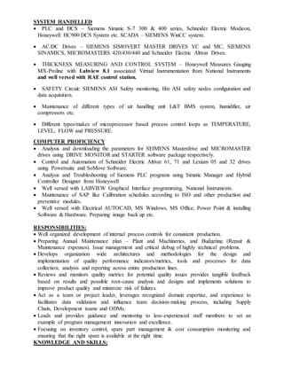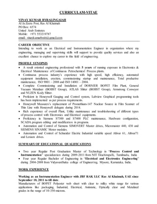 Vinay Kumar Byralingaiah is an Electrical and Instrumentation Engineer with over 5 years of experience in maintenance and process control. He currently works for JBF RAK LLC in Ras Al Khaimah, UAE. He has a Master's degree in Process Control and Instrumentation and a Bachelor's degree in Electrical and Electronics Engineering. His responsibilities include developing internal process controls, preparing maintenance plans and budgets, and improving product quality. He is proficient in SCADA systems, PLCs, drives, and various process control instrumentation.