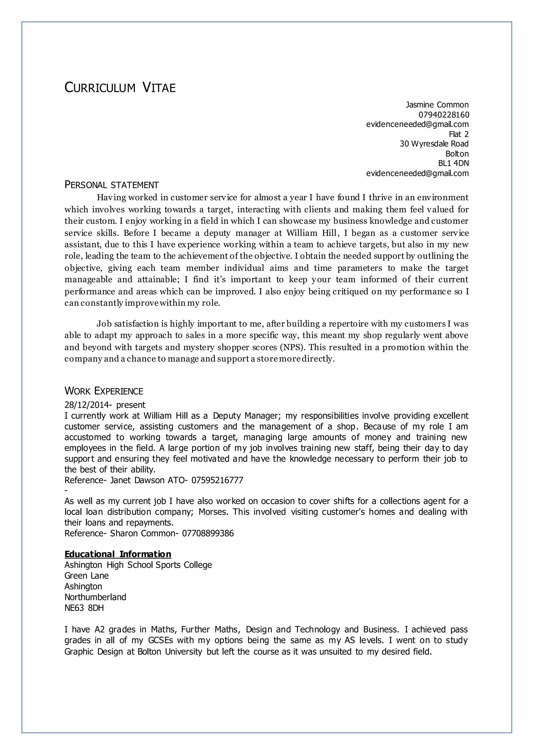 Jasmine Common has over a year of experience in customer service and currently works as a Deputy Manager at William Hill. She enjoys working towards targets and providing excellent customer service. As Deputy Manager, she is responsible for managing the shop, assisting customers, and training new employees. Previously she has also worked as a collections agent for a loan company. She received A2 level grades in several subjects from Ashington High School Sports College and has some university education.